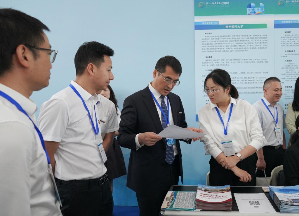 罗鹏到学校、附属医院、第二附属医院、第三附属医院、附属口腔医院、贵州省天然产物研究中心引才展位看望慰问工作人员,仔细了解各单位引才政策及简历投递情况,并与有入职意向的高层次人才亲切交流。