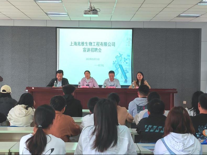 5月15日,上海兆维生物工程有限公司到药学院开展专场招聘宣讲。校党委副书记汤磊出席,药学院党委书记高秀丽主持宣讲会,药学院党委副书记包欢欢、毕业班辅导员及毕业班未就业同学参加。