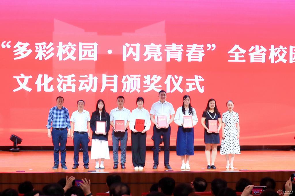 会上,对第十七届“多彩校园·闪亮青春”全省校园文化活动月获奖代表进行颁奖。刘文作为颁奖嘉宾为获奖代表颁奖,并代表学校领取优秀组织奖奖牌。