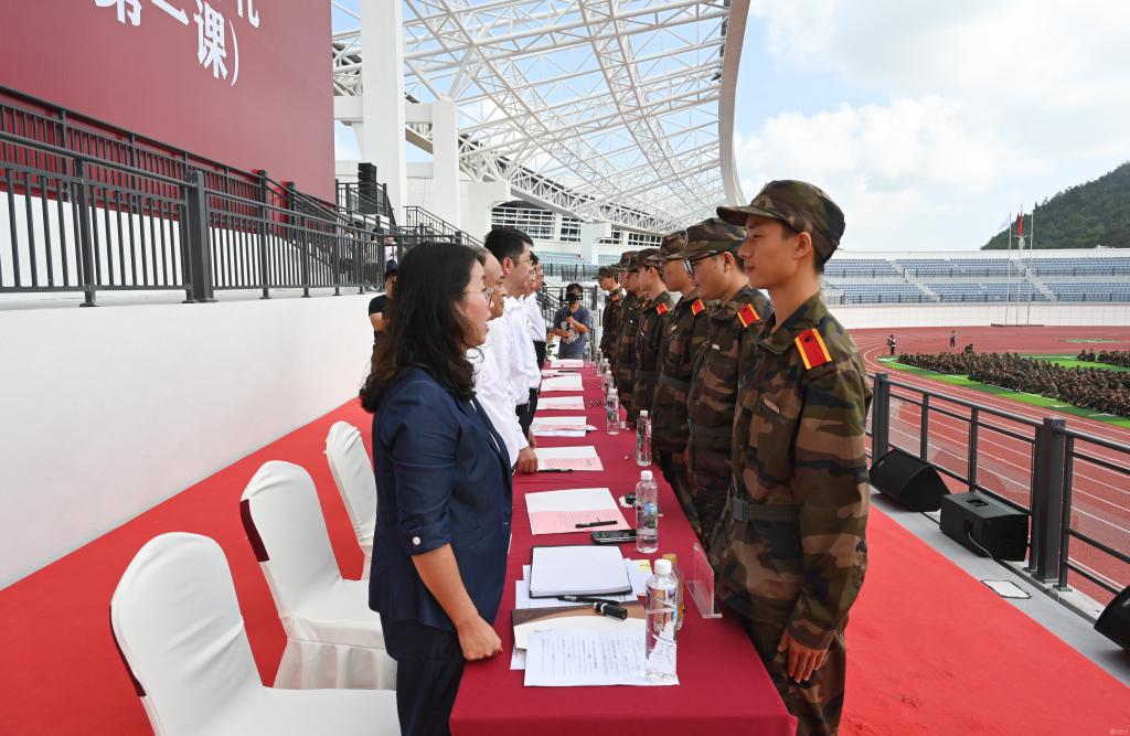 本科生代表、研究生代表依次上台,校领导为2023级新生佩戴校徽。