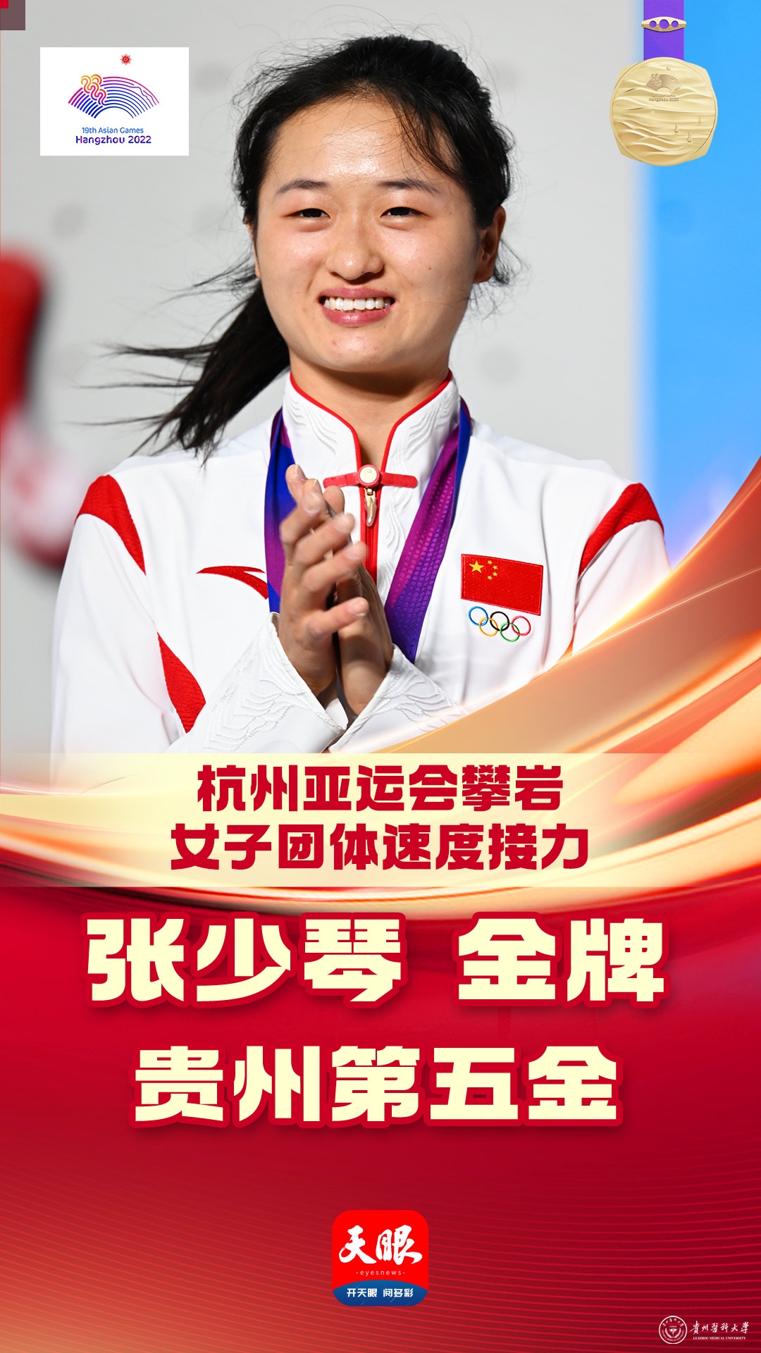 10月4日晚,杭州亚运会攀岩女子团体速度接力赛决赛举行,永利官网运动与健康学院研究生张少琴(接力赛第一棒)及队友邓丽娟(第二棒)、牛笛(第三棒),汪生艳(替补队员)代表中国队参赛,最终以20.925秒的成绩夺得金牌,实现贵医人在亚运会金牌零的突破!