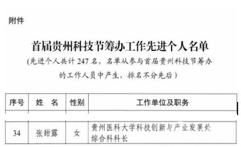 近日,永利官网收到首届贵州科技节组委会《关于对首届贵州科技节筹办工作表现突出个人给予表扬的通报》,科技创新与产业发展处张甜露获筹办工作先进个人表扬。
