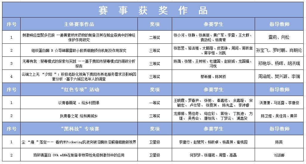 近年来,永利官网高度重视大学生科技创新工作,以“办人民满意的百年医科大学”为奋斗目标,持续推进教育教学高质量发展,努力营造良好的青年参与科技创新氛围,以赛促教、以赛促学、以赛促研、以赛促建,师生参与“挑战杯”等学科竞赛的热情不断高涨,“加入创新团队、瞄准创新高地”成为时下贵医青年学业生涯规划中的热门选项。在今年“挑战杯”比赛中,校赛收到作品496项,报送作品数是上届比赛的4.6倍,55项作品进入省赛评比,其中4项进入国赛主体赛(数量为贵州省高校第二),获奖48项,获奖层次和获奖数量均实现历史性突破。学校师生参与“挑战杯”等学科竞赛的热情不断高涨,科技创新氛围日趋浓厚,办好学科竞赛推动学校科技创新事业高质量发展的成效日益凸显。
