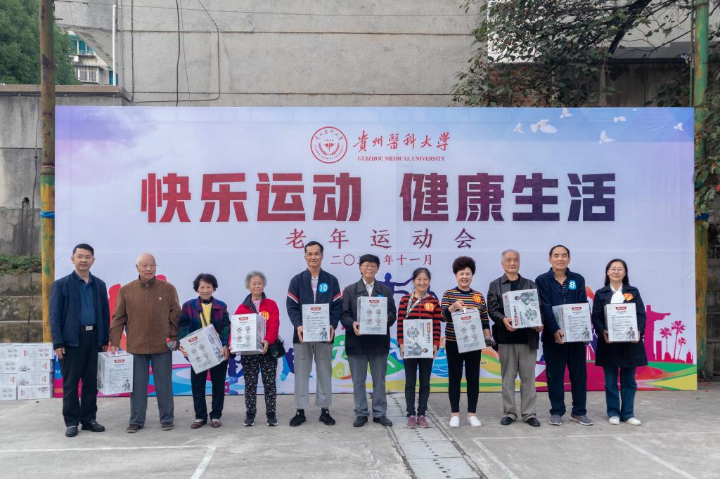 运动会上,刘文,离退休工作处党总支书记、处长张雪晴,姚思勤为获胜老同志颁发奖品。