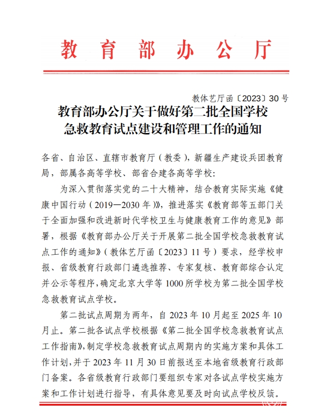 近日,教育部办公厅下发《关于做好第二批全国学校急救教育试点建设和管理工作的通知》文件,公布了《第二批全国学校急救教育试点学校名单》,永利官网获批“全国学校急救教育试点学校”。