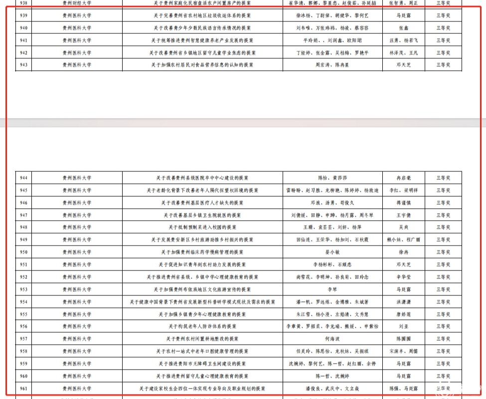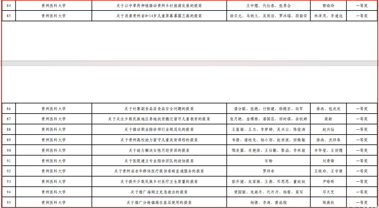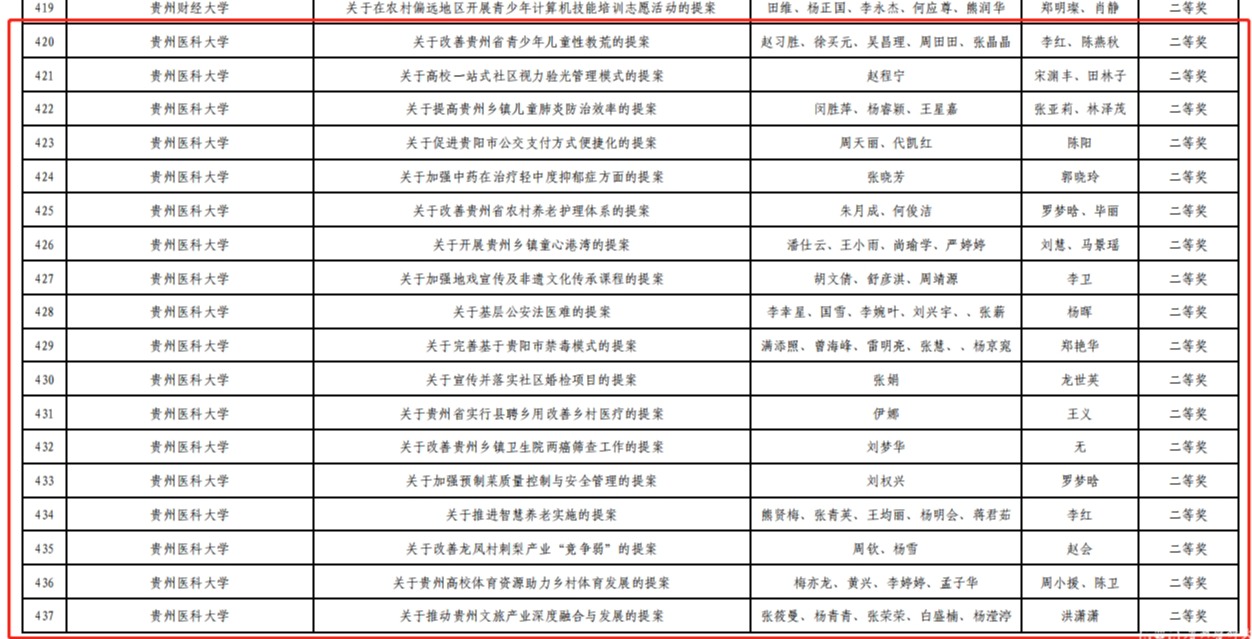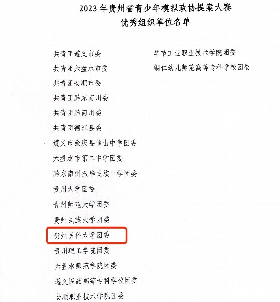近日,团省委、贵州省政协提案委、省学联联合下发了《关于公布2023年贵州省青少年模拟政协提案大赛评选结果的通报》,“77779193永利官网团委”被评为“优秀组织单位”,药学院“关于以中草药种植推动贵州乡村旅游发展的提案”等12个作品被评为“一等奖”,麻醉学院“关于改善贵州省青少年儿童性教荒的提案”等18个作品被评为“二等奖”,基础医学院“关于完善贵州省农村地区垃圾收运体系的提案”等23个作品被评为“三等奖”。