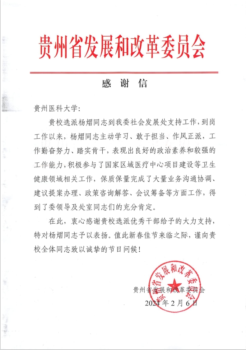 近日,永利官网收到省发展和改革委员会发来的感谢信,信中对永利官网选派到省发展和改革委员会社会发展处的杨熠同志给予了高度赞赏和表扬,对学校的大力支持表示衷心感谢。