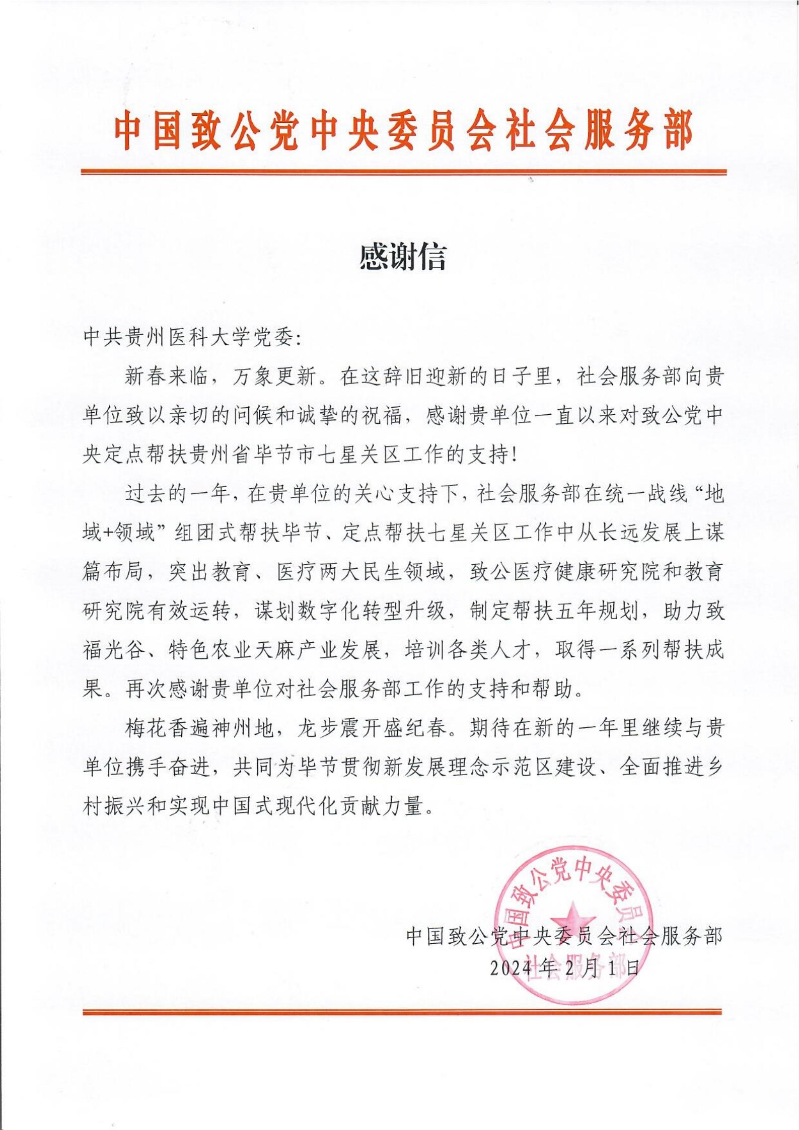 信中提到,过去的一年,在学校的关心支持下,社会服务部在统一战线“地域+领域”组团式帮扶毕节、定点帮扶七星关区工作中从长远发展上谋篇布局,突出教育、医疗两大民生领域,致公医疗健康研究院和教育研究院有效运转,谋划数字化转型升级,制定帮扶五年规划,助力致福光谷、特色农业天麻产业发展,培训各类人才,取得一系列帮扶成果。期待在新的一年里继续与学校携手奋进,共同为毕节贯彻新发展理念示范区建设、全面推进乡村振兴和实现中国式现代化贡献力量。