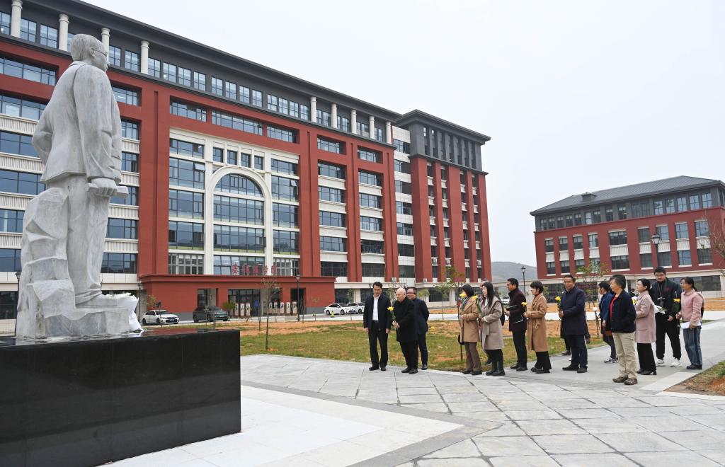 李维华女士、校领导、师生代表怀着崇敬的心情,在云漫湖校区和北京路校区瞻仰了宗恩老院长雕像,并敬献鲜花。