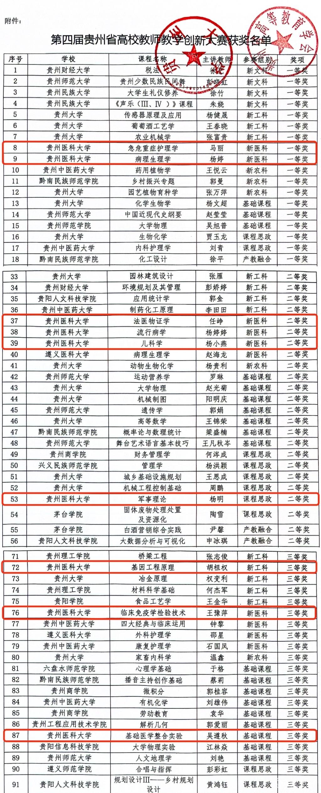 近日,贵州省第四届高校教师教学创新大赛圆满结束,永利官网荣获优秀组织奖,一等奖2项,二等奖4项,三等奖3项,参赛获奖名次和数量实现新突破。其中,护理学院马丽团队、基础医学院杨婷团队获得新医科组一等奖;法医学院任峥团队、公共卫生学院杨婷婷团队、临床医学院杨小燕团队获得新医科组二等奖;医学人文学院杨明团队获得课程思政组二等奖;生物与工程学院胡祖权团队、医学检验学院王豫萍团队、基础医学院吴遵秋团队分别获得新工科组、新医科组、基础课程组三等奖。