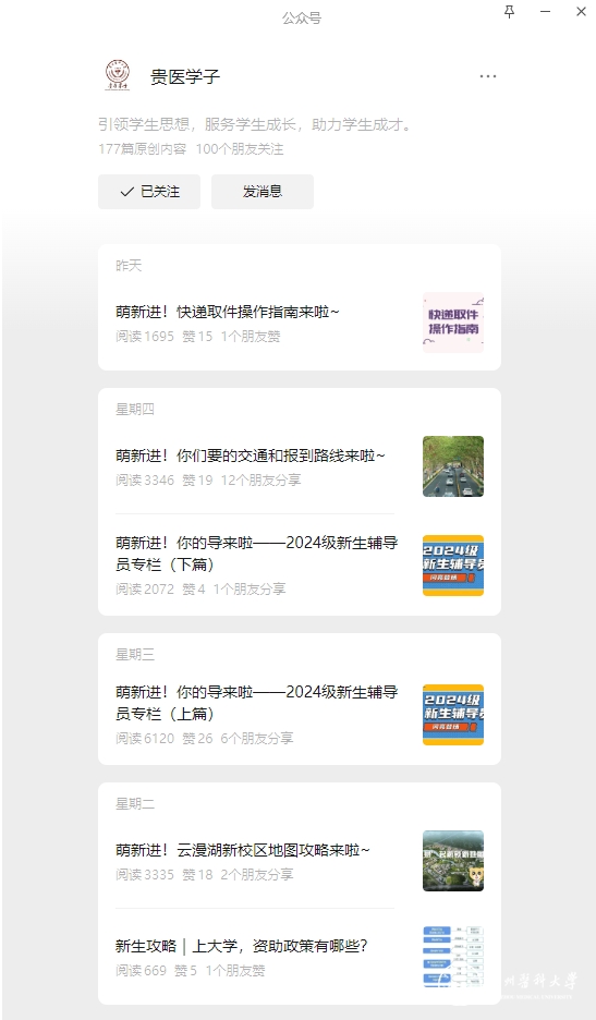 为保障新生更加便捷地顺利入学,学校通过企业微信设置新生入学板块,开展24小时校园AI问答,为新生提供便捷咨询服务。同时,学校还在“77779193永利官网”“贵医学子”等公众号,为新生推送衣食住行攻略,帮助同学们快速融入校园生活。