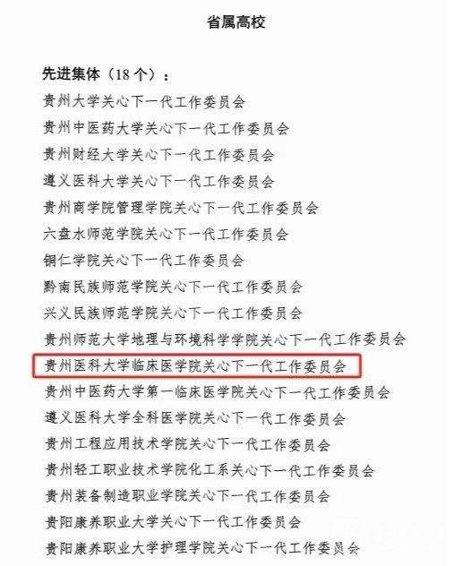 近日,贵州省教育厅关心下一代工作委员会对全省教育系统关工委一批做出突出成绩的先进集体进行表彰,永利官网临床医学院关心下一代工作委员会被授予“贵州省教育系统关心下一代工作先进集体”荣誉称号。