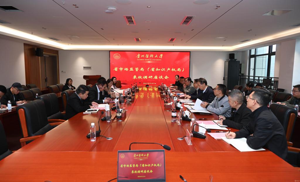 11月5日,贵州省市场监督管理局(省知识产权局)党组成员、副局长赵继红,知识产权运用促进处处长万胜、二级调研员王曰洪,国家知识产权局专利局贵阳代办处主任曹平,贵州大学、贵州师范大学、贵州理工学院、六盘水师范学院、省农科院等高校院所相关职能部门负责人来校调研交流。学校党委副书记、校长罗鹏出席,相关职能部门负责人参加。