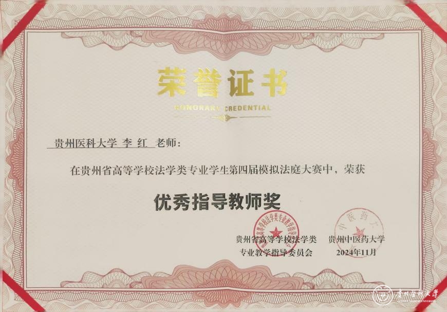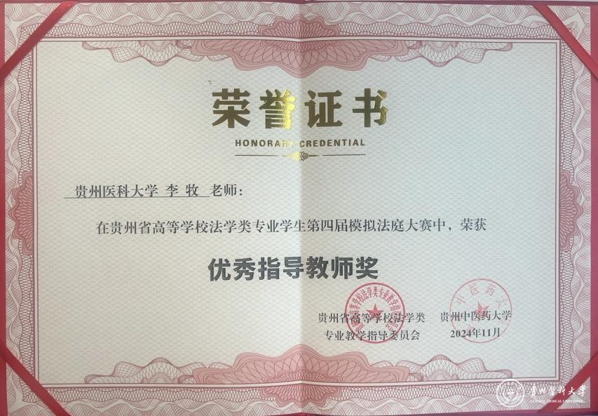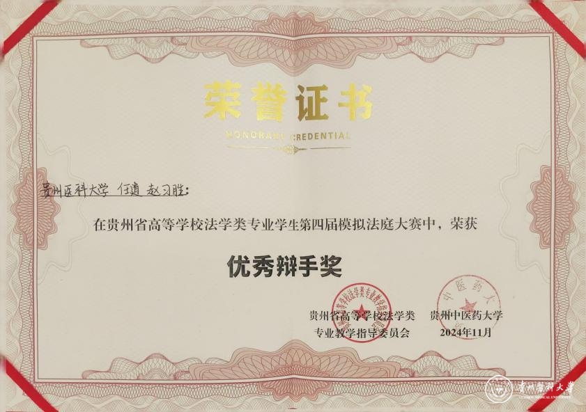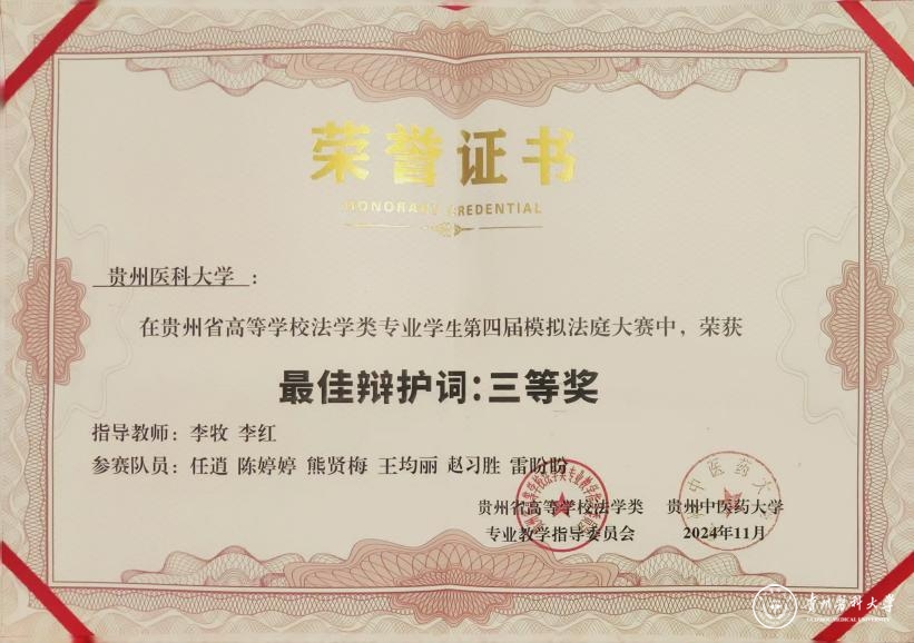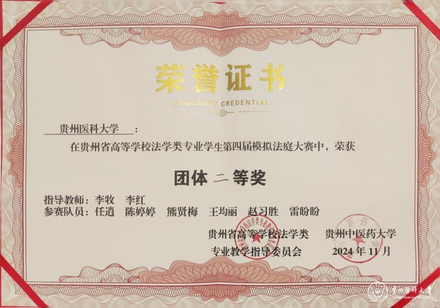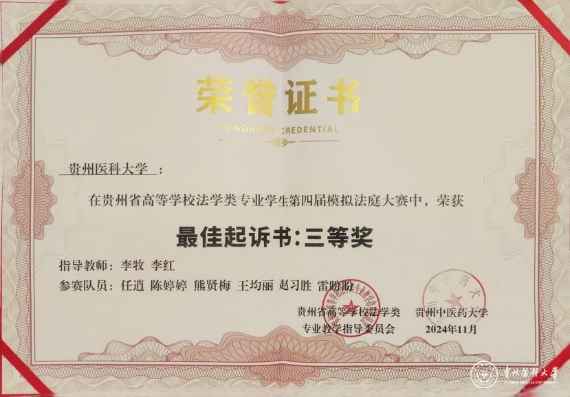 本次参赛队由李牧、李红老师指导,医学人文学院2022级法学专业任逍、赵习胜、王均丽、陈婷婷、熊贤梅、雷盼盼六名同学参赛。经过初赛评比,包括永利官网在内的共八支贵州省法学专业院校队伍进入复赛,在复赛中,永利官网同学展现了深厚的法律功底和严谨的逻辑思维能力,以最高分进入总决赛,并最终获得了团体第二名的好成绩。任逍、赵习胜同学获得优秀辩手奖,法律文书获最佳起诉书三等奖、最佳辩护词三等奖,李牧、李红老师获得优秀指导教师奖。