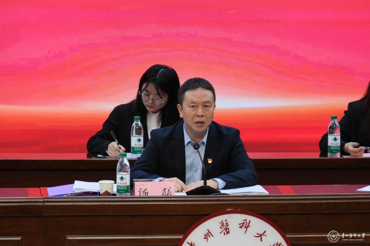 汤磊对大会的召开表示热烈祝贺。他肯定了过去一年,校学生会和校研究生会在学校党委的领导下,在省学联和校团委的具体指导下,在思想政治引领、社会实践活动、服务同学成长成才等方面做的工作。对与会代表及全体贵医青年提出三点希望,一是要筑牢理想信念。加强政治理论学习,在学习中找准历史方位、明确奋斗方向。二是要发奋成长成才。勤于思考、善于总结,不断提升品德修为,努力争创一流业绩,成为所在专业、所在领域的行家里手。三是要勇于创新实践。要发扬不怕苦、不畏难、不惧牺牲的优秀品质,将所学知识转化为解决实际问题的能力。并对各级学生会、研究生会组织提出要求,一是要提升满意度,以增强广大同学的社会化能力为主要目标,打造一批做得实、叫得响的服务项目。二是要提升贡献度,充分发挥党委联系青年学生的桥梁纽带作用。三是要持续推进改革,坚持精干职能、力量下沉、协同发力,不断强化校院两级组织的协同联动能力,以扎实的工作成效赢得广大同学和全校各单位的广泛认可。