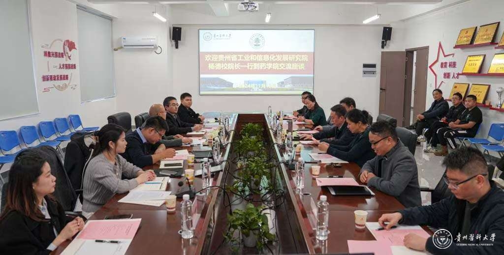 11月18日,贵州省工业和信息化发展研究院院长杨德校一行来校调研交流,调研座谈会在药学院致知楼五楼会议室召开。校党委副书记汤磊出席并讲话。省工业和信息化厅科技处副处长胡灿华、研究院先进制造研究中心主任钟国荣、研究员耿文帅、杨小琴、张桃,以及永利官网科技创新与产业发展处处长涂波、贵州省生态食品创制工程研究中心常务副主任王国泽、组织工程与干细胞实验中心副主任赵星、贵州省化学合成药物研发利用工程技术研究中心副主任张吉泉,药学院党委书记高秀丽、副院长廖尚高、药学院教师代表参加。高秀丽主持。