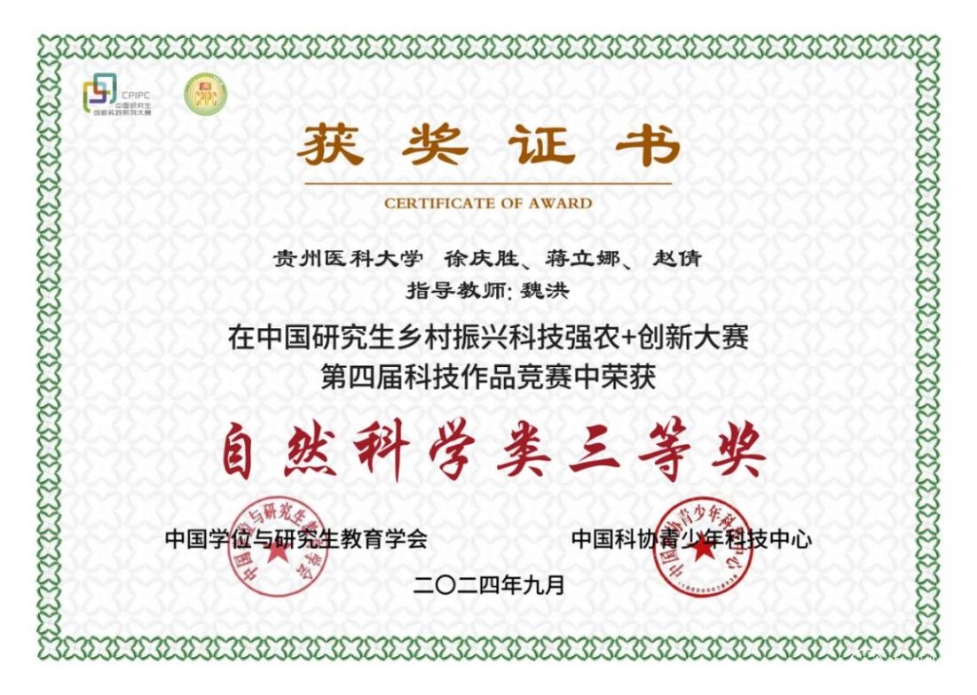 近日,中国研究生创新实践系列大赛各主题赛事陆续公布获奖名单,永利官网三个作品荣获三等奖。其中,基础医学院魏洪老师指导,徐庆胜、蒋丽娜、赵倩参赛的《基于 TLR4/NF-κB 信号通路探索苗药云实感冒合剂 抗呼吸道合胞病毒的分子机制》作品荣获中国研究生乡村振兴科技强农+创新大赛第四届科技作品竞赛自然科学类三等奖。