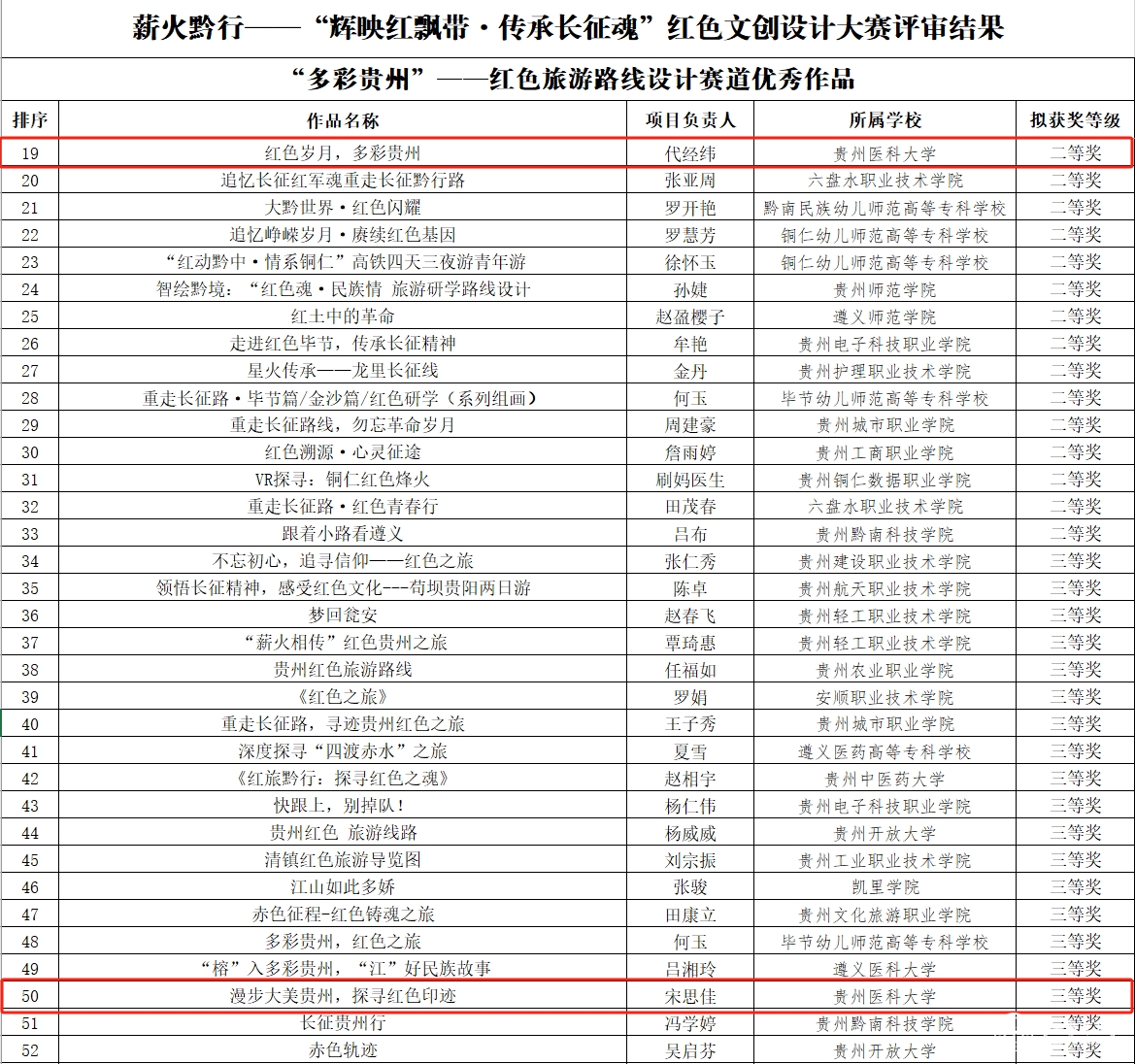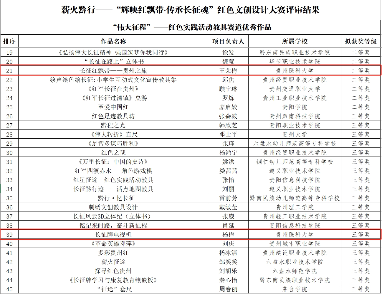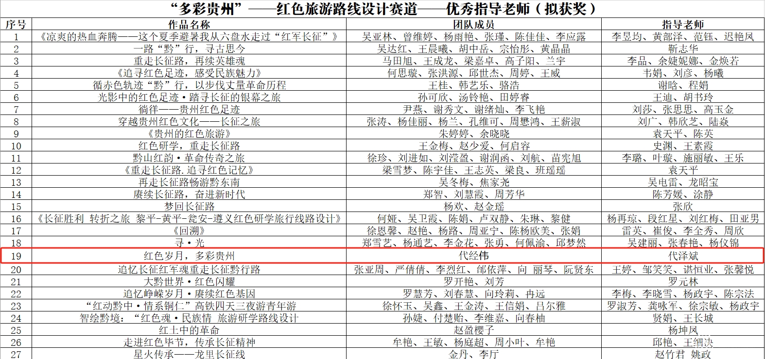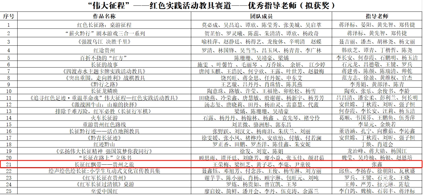 近日,省委宣传部、省委教育工委、省教育厅、省文化和旅游厅举办的薪火黔行——“辉映红飘带·传承长征魂”红色文创设计大赛公示评审结果。永利官网在此次大赛中获奖4项,其中“伟大征程”——红色实践活动教具赛道荣获二等奖1项,三等奖1项;“多彩贵州”——红色旅游路线设计赛道二等奖1项,三等奖1项。张鑫、代泽斌荣获“优秀指导教师”称号。