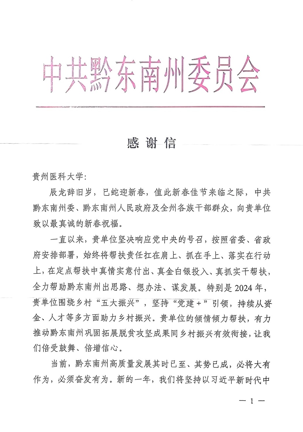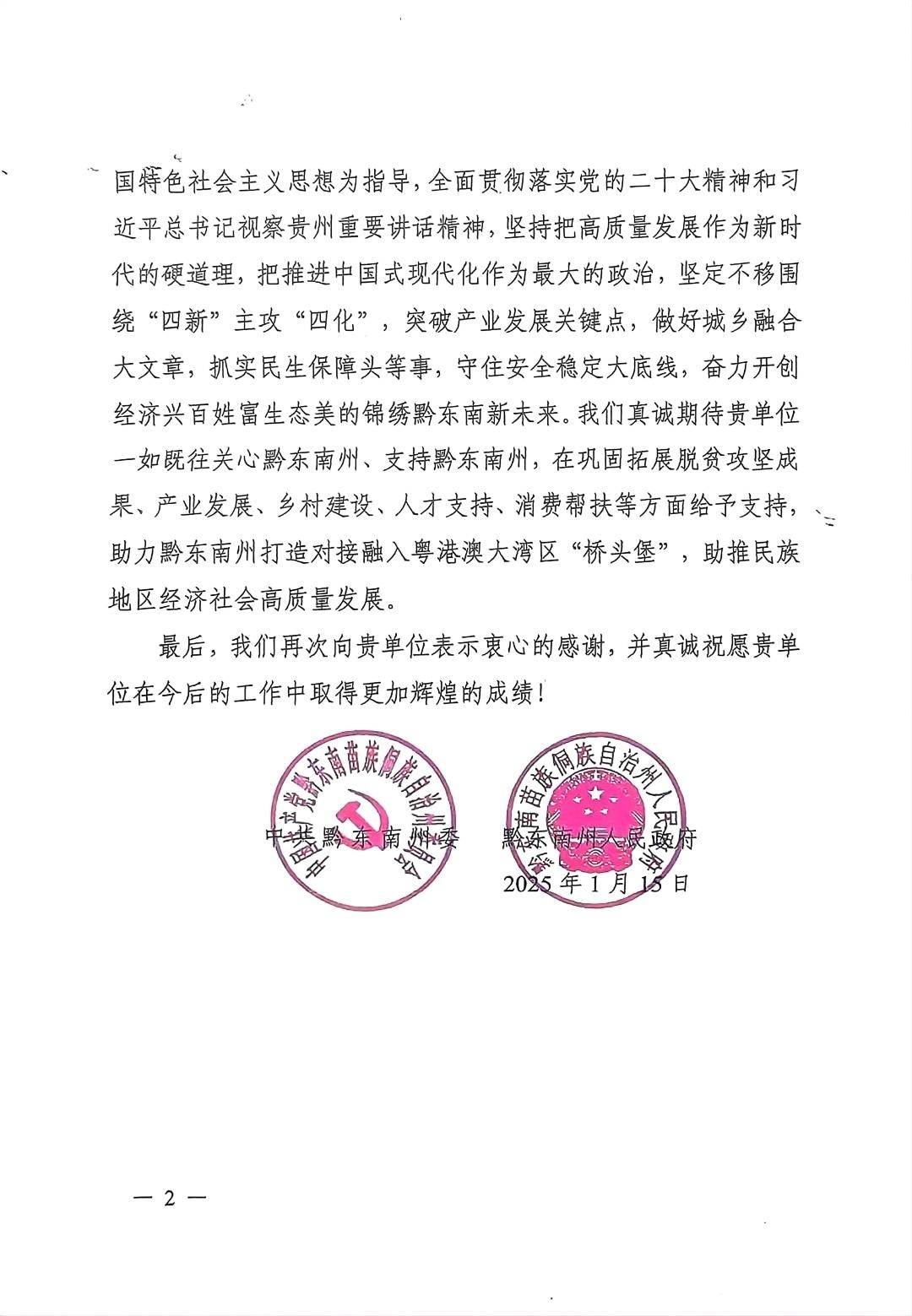 近日,黔东南州委、黔东南州人民政府向永利官网发来感谢信,对永利官网在推动黔东南州巩固拓展脱贫攻坚成果与乡村振兴有效衔接方面所做出的积极贡献表示衷心感谢。