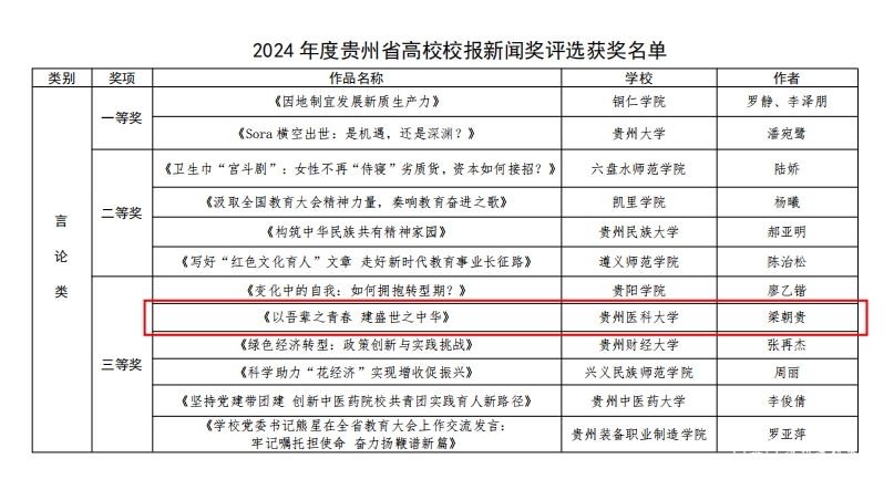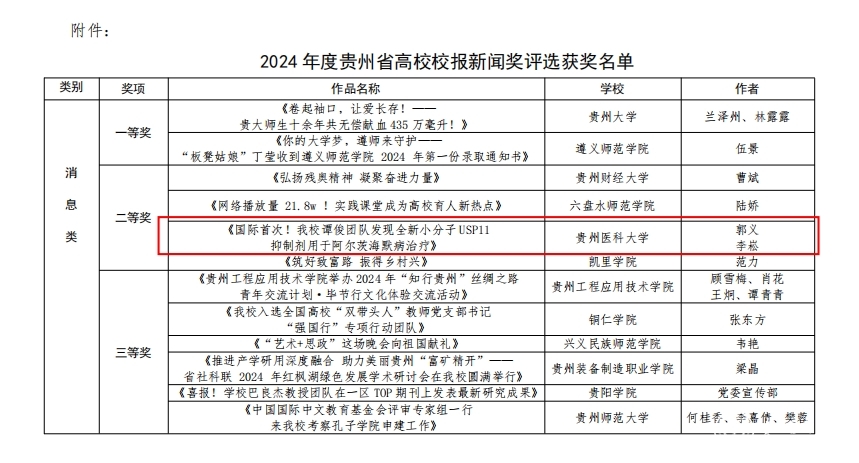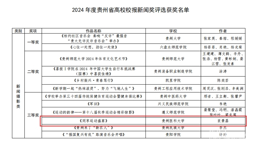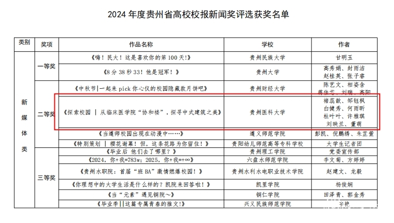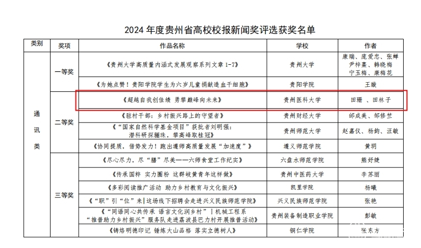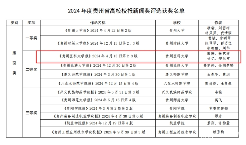 4月30日,贵州省高校校报研究会组织表彰了2024年度贵州省高校校报新闻奖获奖作品和个人,并召开业务培训会,邀请陕西师范大学新闻与传播学院院长陈守湖作“新闻与写作”主题培训。永利官网校报作品与学生记者获评二等奖4项、三等奖2项,优秀学生记者5名。其中,郭义、李崧《国际首次!永利官网谭俊团队发现全新小分子USP11抑制剂用于阿尔茨海默病治疗》获消息类二等奖,田珊、田林子《超越自我创佳绩 勇攀巅峰向未来》获通讯类二等奖,田珊、张艺婵、杨亿、安凤常《77779193永利官网报》2024年4月15日第2-3版获版面类二等奖,褚蕊歆、邹钰枫、白健秀、何雨昕、杜叶叶、许雅琪、刘映兰、董萌《探索校园|从临床医学院“协和楼”,探寻中式建筑之美》获新媒体类二等奖;袁景昌《同享运动盛宴》获摄影类三等奖,梁朝贵《以吾辈之青春 建盛世之中华》获言论类三等奖;梁朝贵、杨亿、袁泽同、安凤常、杨璐璐获“优秀学生记者”。
