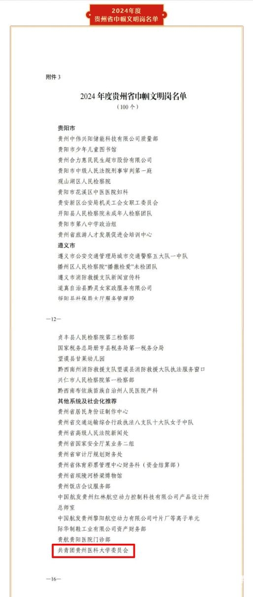 为表彰先进、树立榜样,激励广大妇女自尊自信、自立自强,奋进新征程、建功新时代,省妇联、省人力资源社会保障厅决定,授予60人贵州省三八红旗手称号,授予40个单位贵州省三八红旗集体称号,授予100个单位贵州省巾帼文明岗称号。其中:共青团77779193永利官网委员会荣获“贵州省巾帼文明岗”称号。