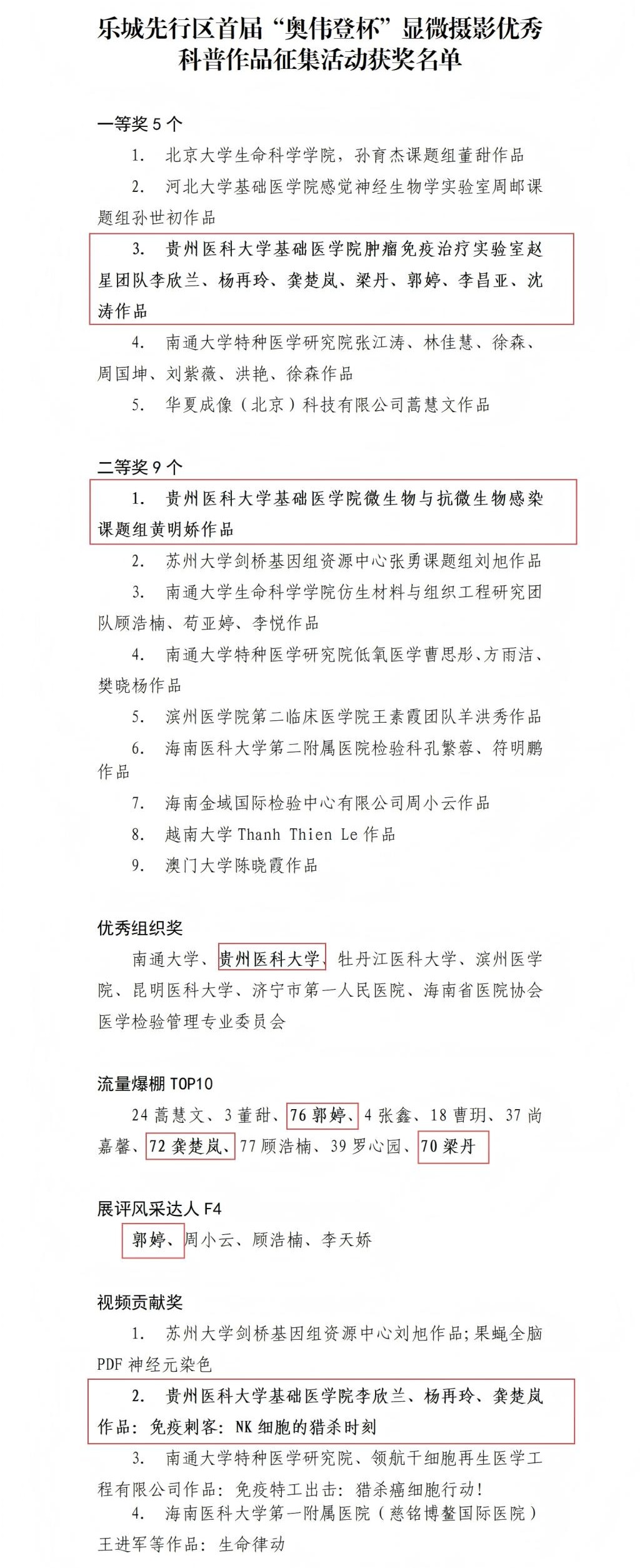 8月18日,海南乐城先行区首届“奥伟登杯”显微摄影优秀科普作品评审结果发布会暨第二届显微摄影征集活动启动仪式在海南国际医学中心举行。永利官网研究生团队表现突出,荣获多个奖项。基础医学院肿瘤免疫治疗实验室赵星团队李欣兰、杨再玲、龚楚岚、梁丹、郭婷、李昌亚、沈涛作品获一等奖;基础医学院微生物与抗微生物感染课题组团队黄明娇作品获二等奖。李欣兰、杨再玲、龚楚岚团队创作的科普视频《免疫刺客:NK细胞的猎杀时刻》获视频贡献奖。郭婷、龚楚岚、梁丹等人入选“流量爆棚TOP10”,郭婷获“展评风采达人”称号。学校获优秀组织奖。