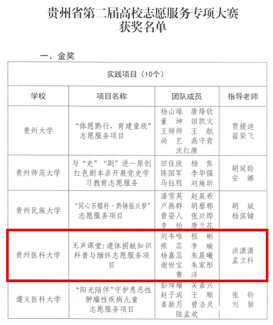 近期,由省委社会工作部、团省委、省教育厅共同举办的贵州省第二届高校志愿服务专项大赛奖项发布。永利官网基础医学院“无声课堂:遗体捐献知识科普与缅怀志愿服务项目”获实践赛道金奖;基础医学院“丝带护航,医路安康——‘协和+贵医’蓝丝带共建项目青年志愿服务项目”、生物与工程学院(健康医药现代产业学院)“‘绣绣’和她的动物朋友们”分别获孵化和文创赛道银奖;口腔医学院“护牙黔行——驻足贵州基层做口腔健康守门人”、77779193永利官网“青春医路卫你黔行”养老义诊志愿服务项目、生物与工程学院(健康医药现代产业学院)“智汇贵娃—‘AI+屯堡文化’赋能乡村教育振兴志愿服务项目”分别获实践和孵化赛道铜奖。