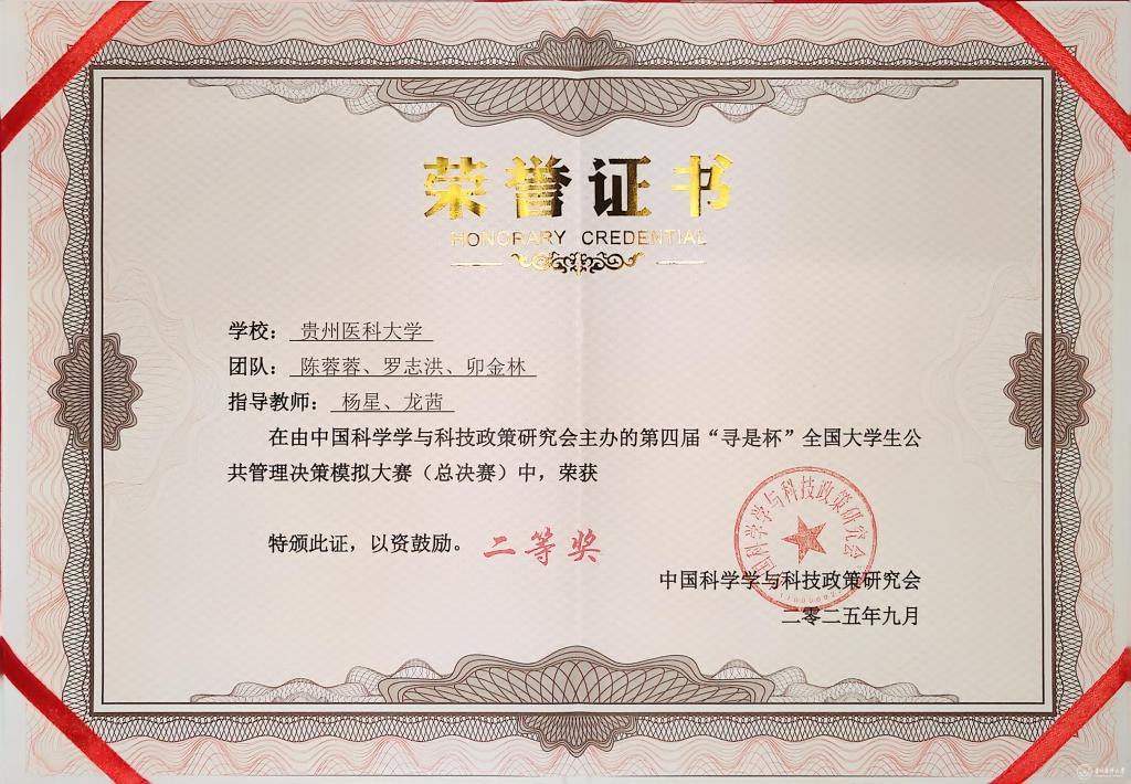 近日,第四届“寻是杯”全国大学生公共管理决策模拟大赛总决赛在西安交通大学举行,永利官网医药卫生管理学院2023级公共事业管理专业陈蓉蓉、罗志洪、卯金林三位同学组成的代表队,在教师杨星、龙茜的悉心指导下,凭借出色的决策分析能力与创新思维,一路过关斩将,最终斩获全国总决赛二等奖。