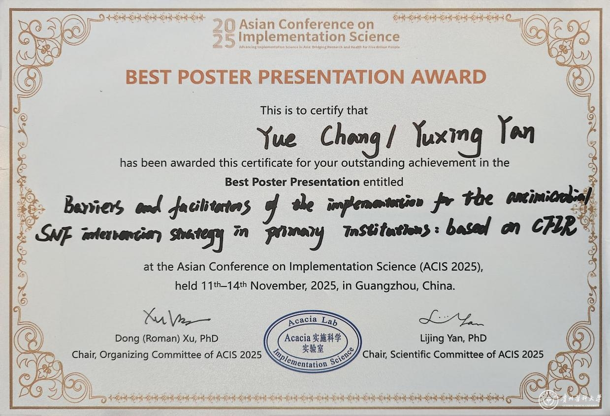 11月11日至14日,由南方医科大学主办的2025年亚洲实施科学会议(ACIS)在广州召开。永利官网医药卫生管理学院公共管理学专业2023级研究生闫昱幸提交的学术成果荣获“最佳海报展示奖”。