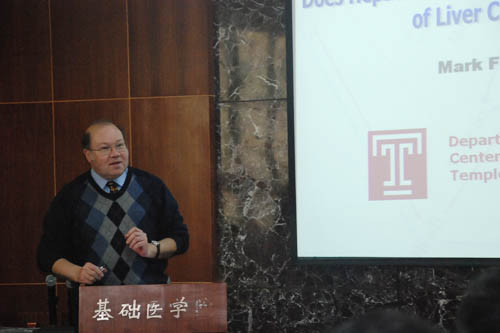 Mark Feitelson教授以“Does Hepatitis B x Antigen Promote the Appearance of Liver Cancer Stem Cells?”为题,为我院基础医学院宗恩学术论坛作了精彩学术报告。Mark Feitelson教授介绍了肝癌发病机制的最新研究进展,分析了Hepatitis B x Antigen导致Stemness的各种机制。