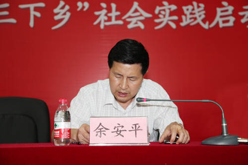 校党委副书记、纪委书记余安平对此次暑期“三下乡”活动提出几点希望,他希望参加本次“三下乡”社会实践活动的同学们,要发扬爱国主义优良传统,全面贯彻落实科学发展观,建设社会主义核心价值体系,切实加强和改进大学生思想政治教育,积极投身家乡建设,树立科学的价值观和人生观,在活动中充分运用所学知识,结合专业特点,在社会实践中切实增强自身素质,做合格大学生,做合格社会主义接班人,为投身祖国建设积蓄更多的力量。同时,他还强调了活动的安全问题,希望带队教师和同学们一定要牢牢树立“安全第一”的思想,始终把安全工作放在首位。在实践过程中一定要计划周详,准备充分,严守纪律,服从指挥,不断增强自我保护意识,与实践地接收单位和学校有关部门保持密切畅通的联系,确保实践活动安全顺利开展。