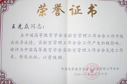 永利官网设备处处长王先众同志在中国高等教育学会实验室管理工作分会工作中做出优异成绩,实验室管理工作分会工作产生积极影响,被评为中国高等教育学会实验室管理工作分会先进工作者称号。