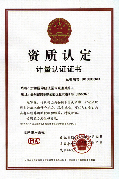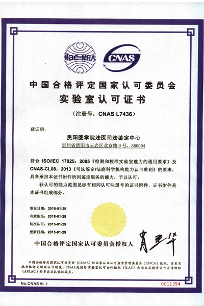 永利官网法医司法鉴定中心于2014年12月正式通过中国合格评定国家认可委员会(CNAS)和国家认证认可监督管理委员会(CMA)专家组的现场评审并于近日取得相关证书(见附图),成为贵州省内第一家通过国家级(法医类)实验室和检查机构资质认定与认可的司法鉴定机构,认证认可范围包括法医病理学、法医临床学、法医物证学、法医毒物学四大类,准许向社会出具具有证明作用的(法医类检测和检查)数据和结果,准许在机构场所和鉴定文书上使用CNAS和CMA标识及徽章等。此项证书的获取表明永利官网法医鉴定中心鉴定水平已达到全国司法鉴定领先水平。
