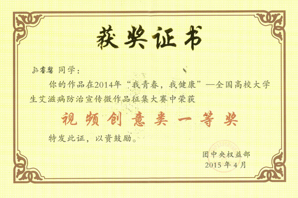 “我青春 我健康”——全国高校大学生艾滋病防治宣传微作品征集大赛表彰活动在厦门举行,永利官网公共卫生学院2014级预防医学专业孙睿馨同学的作品《幸福之路》,荣获全国“视频创意类一等奖”。