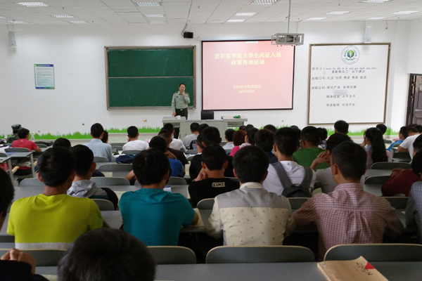 5月11日下午,永利官网在新校区7501教室开展了2015年大学生应征入伍政策咨询活动。参加本次活动的有花溪区武装部政委吕晋中校、校学工部副部长周辉、花溪区武装部政工科科长潘朝滨少校、花溪区民政局优抚科科长周用红及各院系选派的135名学生代表。