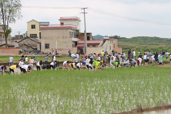 在村有关人员的带领下,师生们不仅参观考察了当地的村容村貌及经济社会发展情况,而且还深入村民家中,对当地的收入、教育、医疗、新农村建设等情况进行了调研访谈。眼下正是插秧的季节,田间里到处是插秧的村民,师生们也不甘示弱,在村民的示范、指导和组织下,纷纷来到满是泥土的田埂上,挽起衣袖和裤脚,走下水田,一只手拿着翠绿的秧苗,另一只手伸进浑浊的泥水,小心翼翼地插下一束束秧苗,动作虽不娴熟,但却有条不紊。一簇簇、一行行,两个小时后,水田里披上了绿衣裳,尽管满身是泥,可师生们感觉心里很甜蜜。