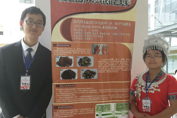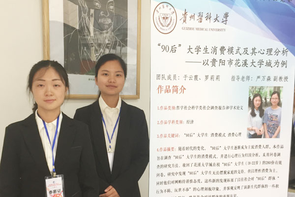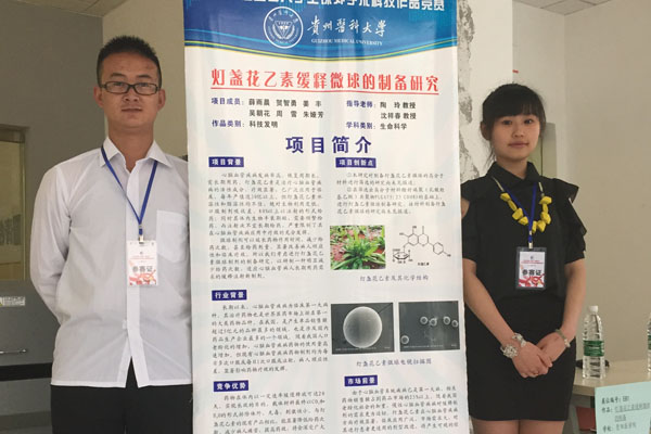 经过评委们的认真评审,永利官网参赛的4件作品全部获奖。其中,2011级医学生物技术夏雪等同学的作品《G蛋白与荧光蛋白在肝癌细胞中融合表达的研究》(指导老师:曾柱、胡祖权)荣获自然科学类一等奖;2012级临床医学梁丹丹等同学的作品《探究苗药四大血对CIA大鼠NF-KB、MAPK通路及OPG/RANK/RANKL系统的影响》(指导老师:吴宁、张金娟)荣获自然科学类二等奖;2014级药剂学研究生薛雨晨等同学的作品《制备灯盏花乙素微球的最佳高分子材料筛选的方法》(指导老师:陶玲、沈祥春)荣获科技发明制作类二等奖;2014级应用心理学于云霞等同学的作品《“90后”大学生消费模式及其心理学分析(以贵阳市花溪大学城为例)》(指导老师:严万森)荣获哲学社会科学类三等奖。