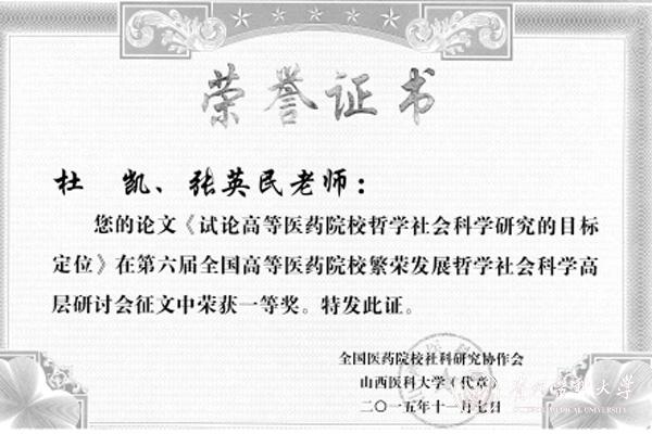会上,永利官网医学人文学院杜凯教授、张英民副教授提交的《试论高等医药院校哲学社会科学研究的目标定位》荣获本次高层研讨会征文一等奖。