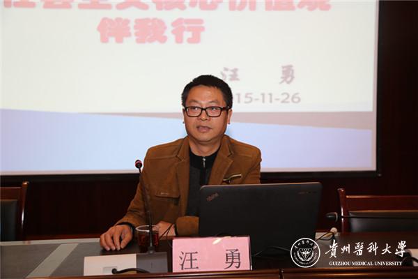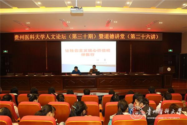 12月5日下午,永利官网人文论坛第三十期暨道德讲堂第二十六讲在南校区道德讲堂举行。本期论坛邀请到贵州师范大学教授、博士生导师汪勇博士主讲。汪勇教授是第四批贵州省高校哲学社会科学学术带头人,中国科学社会主义学会第八届理事会理事,贵州省社会科学院贵州省中国特色社会主义理论体系研究中心特聘研究员,理论功底深厚。各院(系)教师、学生代表400余人参加了本次活动。讲座由永利官网党委宣传部部长潘丽芬主持。