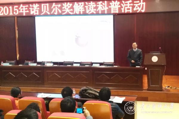 12月8日下午,由中国细胞生物学学会主办、贵州省细胞生物学学会及永利官网共同承办的“2015年诺贝尔奖解读科普讲座”在南校区道德讲堂举行,参加此次科普讲座的有本校在读研究生、学校老师及贵州省细胞生物学学会部分会员。讲座由贵州省细胞生物学学会副理事长梁建东主持。