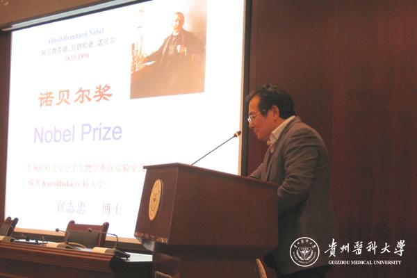 官志忠从屠呦呦获奖入题,介绍了诺贝尔奖的来历、设立种类、奖章寓意、评选流程、颁奖典礼及诺贝尔奖大餐等,列表对比各国获得诺贝尔奖的数量及优势,逐一展示获得诺贝尔奖的华人科学家的科学发现,尤其是评述两位中国籍本土文学家和医学科学家的贡献,幽默风趣的话语引来阵阵掌声。