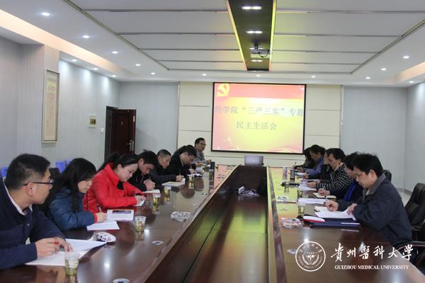席晓岚代表班子通报上年度民主生活会征求意见的整改落实情况和专项巡视整改落实情况,对药学院“三严三实”专题民主生活会会前准备按要求落实情况予以通报,汇报了党委班子一年来的工作,结合“三严三实”专题教育,代表领导班子进行班子对照检查,同时组织班子成员开展自我批评和相互批评,联系班子和个人实际情况深入查摆问题,剖析原因,提出整改措施。