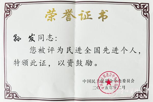 永利官网临床医学院副院长、附属医院副院长、民进省委常委、民进贵医支部副主委孙发博士2015年度因在参政议政、民主监督和社会服务等工作中表现突出,被中国民主促进会中央委员会授予“民进全国先进个人”荣誉称号。