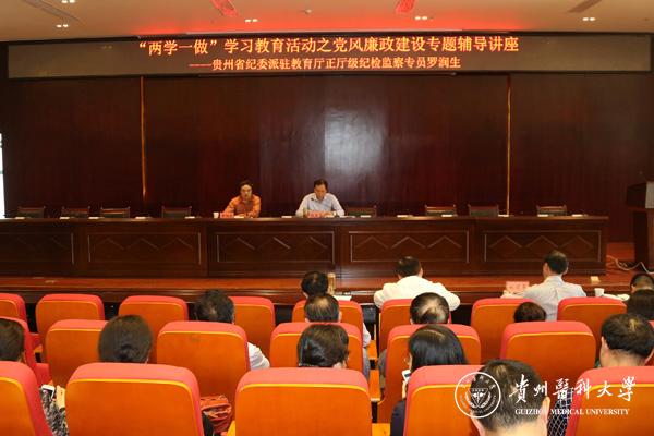 5月5日,永利官网邀请贵州省纪委派驻教育厅正厅级纪检监察专员罗润生作“两学一做”学习教育之党风廉政建设专题辅导讲座,讲座由校党委书记林昌虎主持。校领导、重点实验室党政班子成员、各附属医院党政主要负责人、全校处级干部及各基层党委(党总支)纪检委员200余人参加了会议。