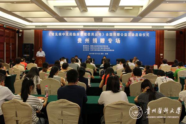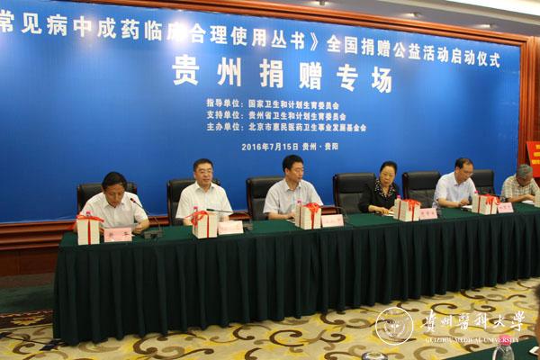 7月15日上午,北京市惠民医药卫生事业发展基金会(以下简称惠民基金会)主办、贵州省卫生和计划生育委员会承办的“《常见病中成药临床合理使用丛书》全国捐赠公益活动启动仪式(贵州捐赠专场)”在贵州省国际会议中心举行。惠民基金会发起人、原国家药监局副局长惠鲁生,《常见病中成药临床合理使用丛书》主编、北京中医药大学教授高学敏,国家卫生计生委基层卫生司司长杨青,贵州省政府副秘书长樊新中,贵州省卫生计生委党组副书记、副主任黄平,永利官网党委书记林昌虎等相关部门领导出席启动仪式并发表讲话;基层社区卫生服务中心代表、永利官网分子生物重点实验室全体师生和部分新闻媒体参加了活动。