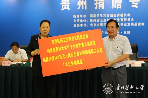 北京市惠民基金会自2008年成立以来,作为社会公益组织,以“关注民生,促进健康,探索公益卫生事业发展之路”为宗旨,为我国医药卫生事业的发展做出了重大贡献。为进一步支持和帮助贵州医药卫生事业发展,惠鲁生女士代表惠民基金会向永利官网分子生物学重点实验室捐赠了价值180万元人民币的全自动核酸提取工作站一台,官志忠教授代表学校接受捐赠。