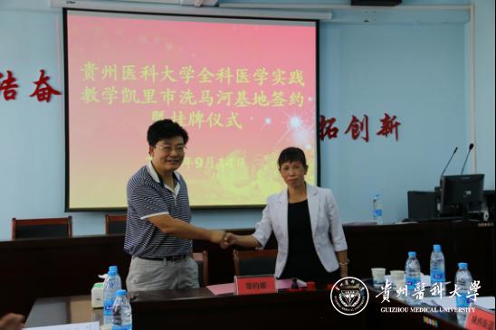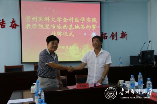 第二附属医院院长赵代伟、副院长任鹏和临床教学部管理人员,第三附属医院科教科负责人,黔东南州卫生计生委、凯里市卫计局、凯里市洗马河街道办事处、城西街道办事处的负责人及三所社区卫生服务中心的全体人员、实习生参加了签约挂牌仪式。