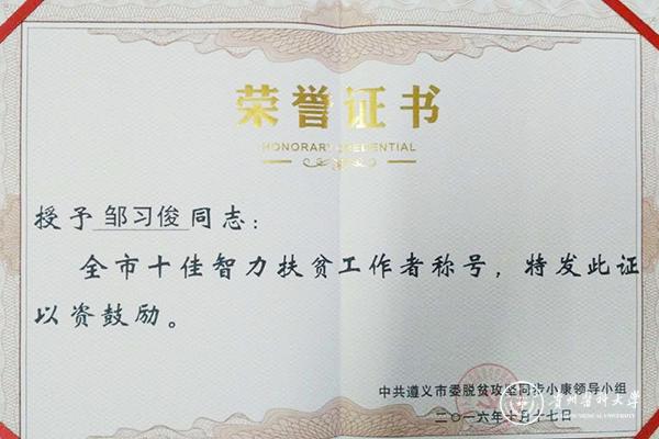 近日,遵义市委脱贫攻坚同步小康领导小组表彰了一批扶贫济困、敢于贡献、心系群众、守望相助、勇于担当、改革创新的先进个人和集体。由永利官网选派的科技人员邹习俊同志,在挂职遵义市汇川区高坪镇科技副职期间,工作成绩突出,被授予“十佳智力扶贫工作者”称号。