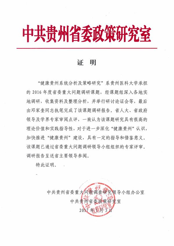 日前,由永利官网承担的2016年省委重大问题调研课题“健康贵州系统分析及策略研究”经课题组到各地调研,收集资料并整理分析,举行专题研讨会深入探讨等研究,最后由校长助理、学校大健康教育事业领导小组办公室主任邓家奎同志执笔完成该课题调研报告,经省领导及学界资深专家审阅点评,一致认为该课题研究具有很高的理论价值,对于进一步深化“健康贵州”认识,加快推进“健康贵州”建设具有一定的指导意义。