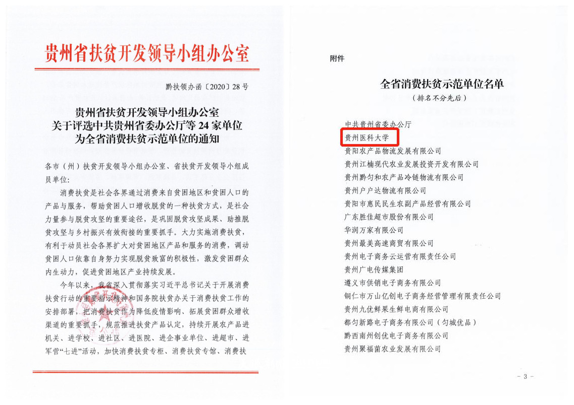 此外,按照省教育厅消费扶贫助力决战决胜脱贫攻坚的相关通知要求,2020年学校联合各附属医院工会采取“以购代捐、以买代帮”的形式,帮助三穗县解决滞销的白条鸭、鸡、猴头菇和水果等,总计约150万元。全校教职医护员工也积极参与到“扶贫暖心购”活动中,通过电商、微商和团购群等渠道开展消费扶贫。